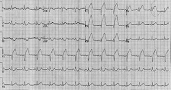 Sinh hiệu tại khoa cấp cứu: huyết áp 85/45 mmHg, nhịp tim 105 lần/phút, SpO2 94%. ECG như hình bên dưới.