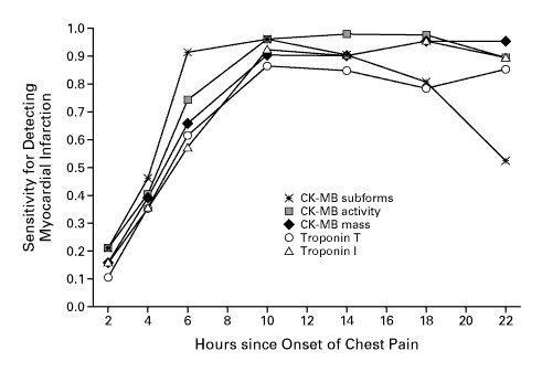 Hình minh họa dưới đây cho thấy diễn tiến theo thời gian của các dấu ấn này sau NMCT, giúp so sánh sự tăng và giảm của myoglobin, CK, CK-MB, troponin I và LDH theo giờ và ngày sau khi khởi phát triệu chứng.