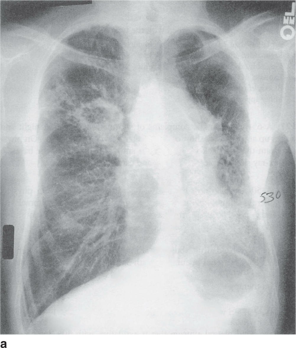 - X-quang hình A cho thấy tổn thương khu trú vùng giữa phổi phải, có hình ảnh hoại tử tạo khoang, phù hợp với viêm phổi tụ cầu – có thể diễn tiến thành áp xe phổi nếu khoang lớn hơn 2 cm.